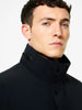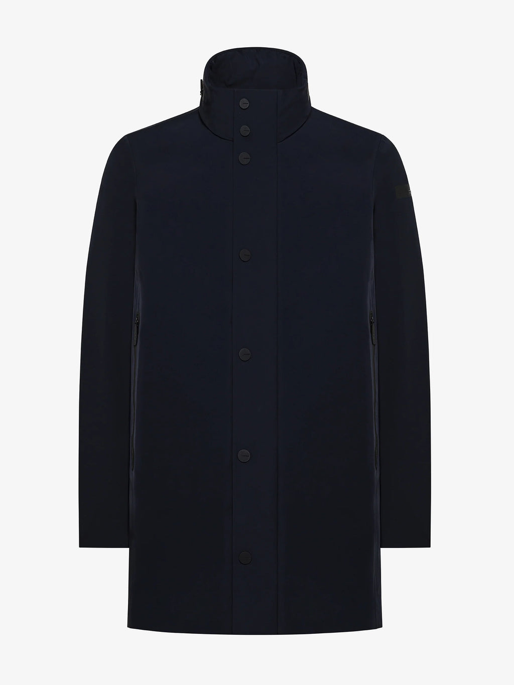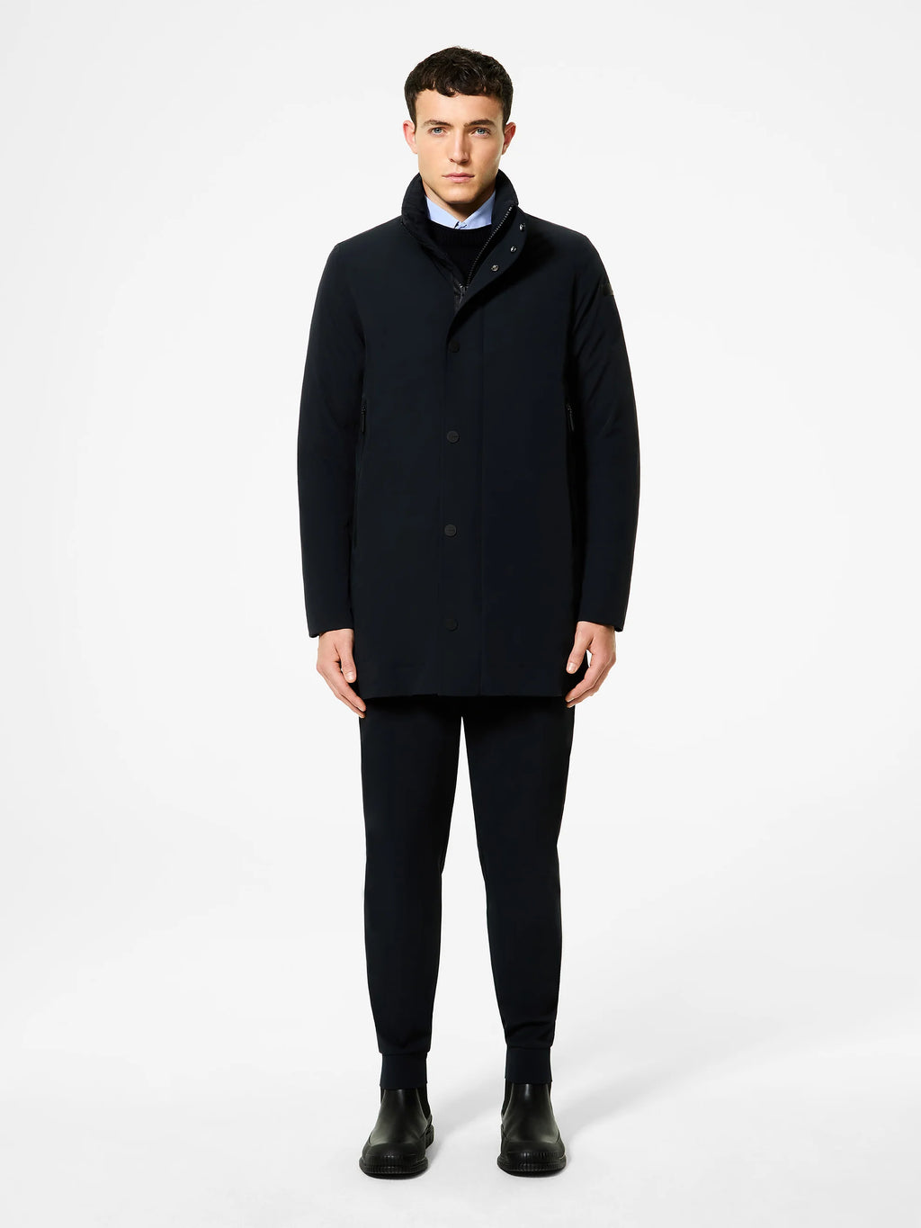 The men's three-quarter length overcoat has been reinterpreted in a contemporary, minimalist key, enhanced by the use of hi-tech materials and refined details. The fully taped construction features the membrane Stratofabric#3, providing waterproof protection while maintaining breathability. The Montecristo fabric exterior, with its smooth feel and matte finish, is accentuated at the front by rubberized snap buttons on the placket, which conceals the full zip closure with double sliders, flanked by large heat-applied pockets. The high, protective collar allows access to the utility hood. The 90/10 duck down padding, which is contained in the tubic channels of the exclusive Floating Shield system, provides a perfect fit and enhanced comfort for the straight cut and regular fit. The interior is complete with a breast pocket with double orange welt, next to the heart-shaped "Made with love, designed in Tuscany" tag. The black micro-injected logo on the left sleeve adds a signature touch to this outerwear.
