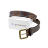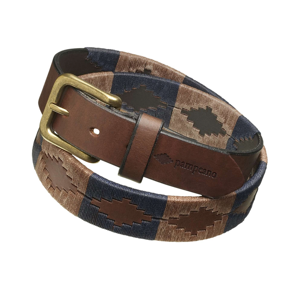 An understated brown leather belt for men featuring a quiet blend of navy and brown weaving. The repeating pampa patterns carry a heritage style suited to relaxed sophistication.