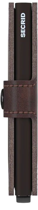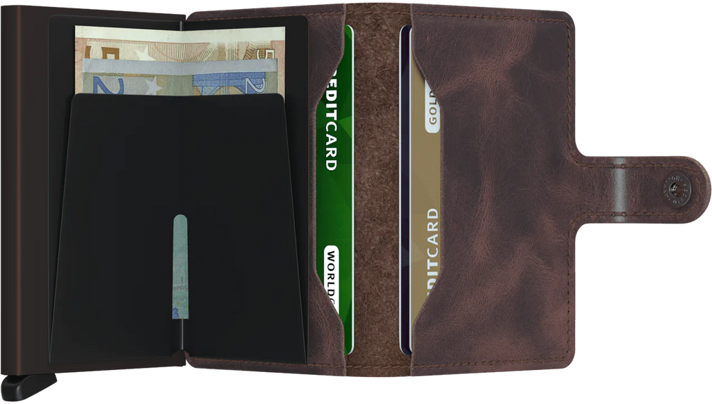 Miniwallet Vintage ChocolateAniline geverfd, afgewerkt met waxWordt donkerder en glanzender door gebruikEuropees RundleerCardprotector (4-6 kaarten)4 Extra kaartenPapiergeldVisitekaartjesBonnetjes